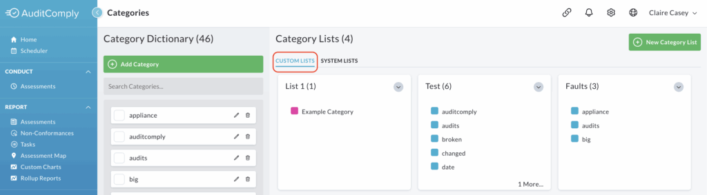 The Categories section organises all predefined answer sets into two subsections: Custom Lists and System Lists