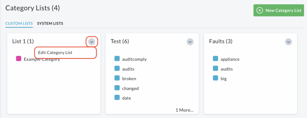 To amend a category list, click on the dropdown menu button located in the right-hand corner of the desired list.