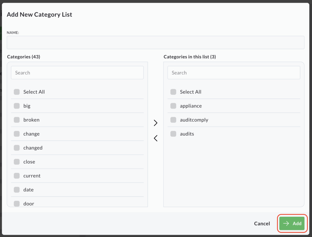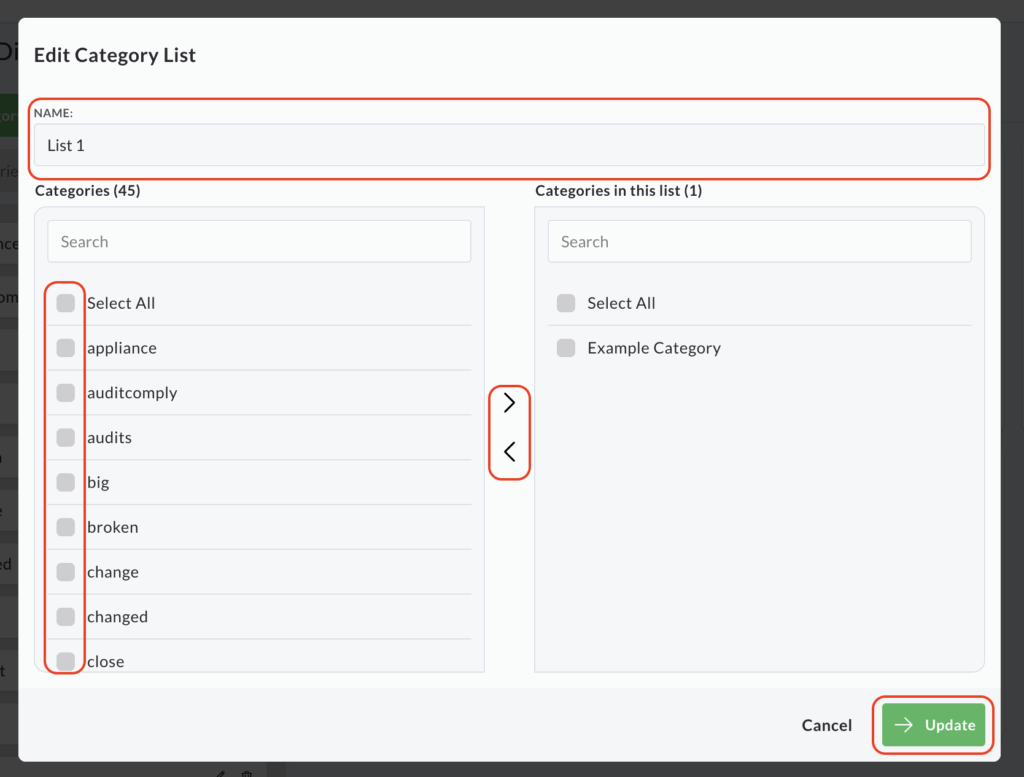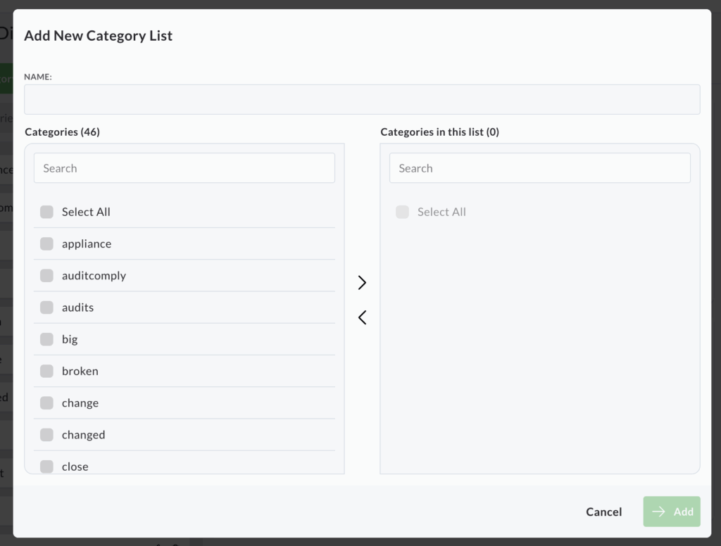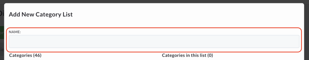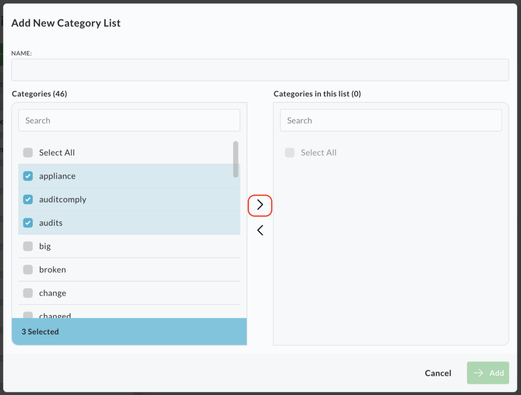 On the left hand side column, select the individual categories from the Category Dictionary that you wish to include in your new list.