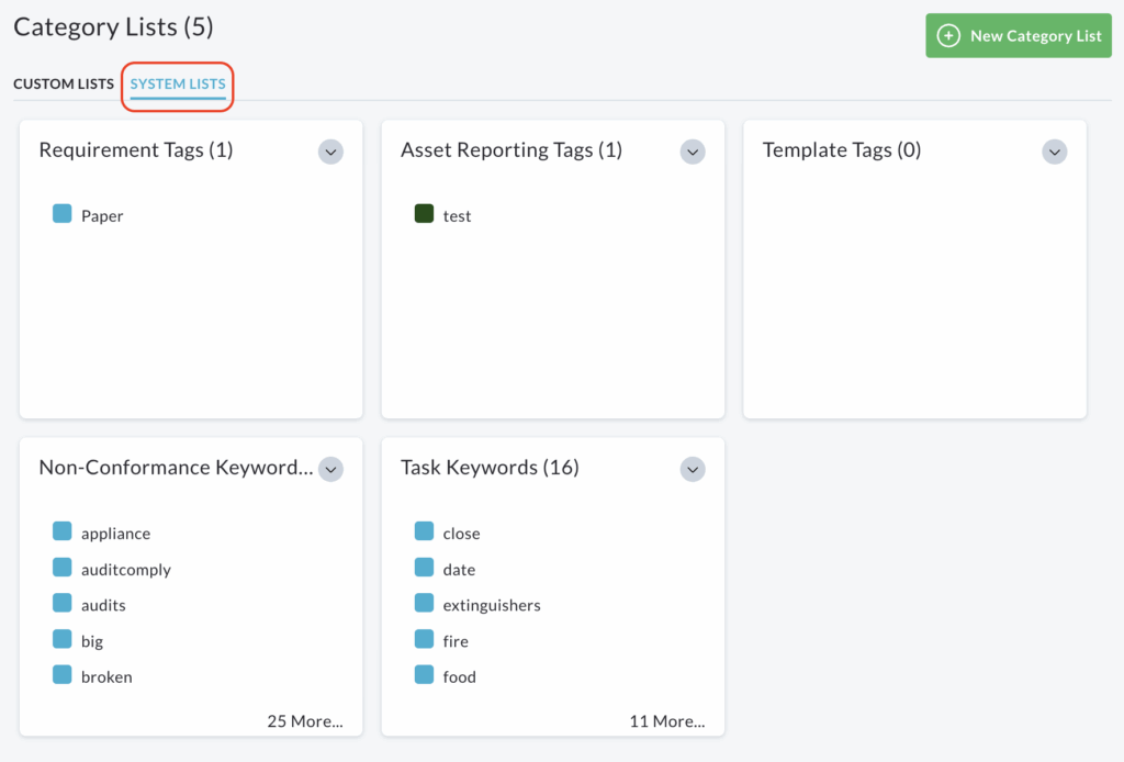 Location Note: Although the New Category List button is visible on both the Custom Lists and System Lists tabs, all new lists created by users will be added only to the Custom Lists page.