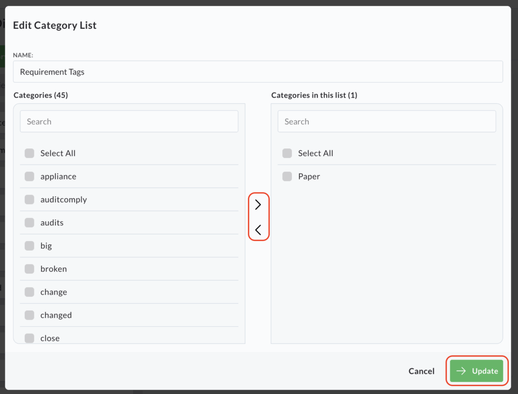 Categories can be moved between the two columns available, using the directional buttons in between them, to either add them or remove them from the category list.