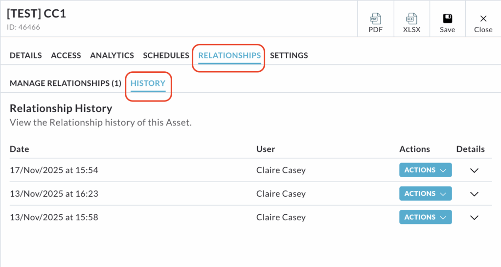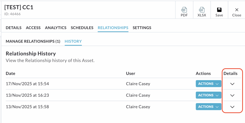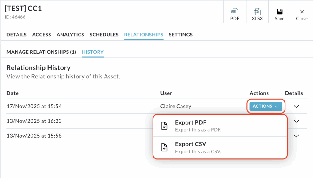The Actions column allows you to export the specific details of a recorded relationship change.