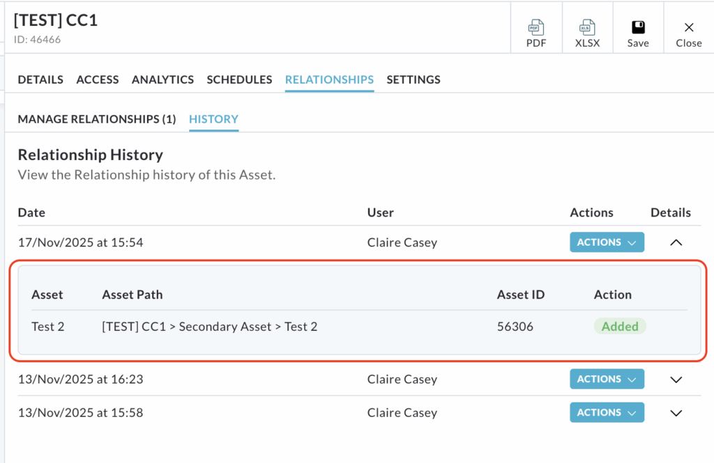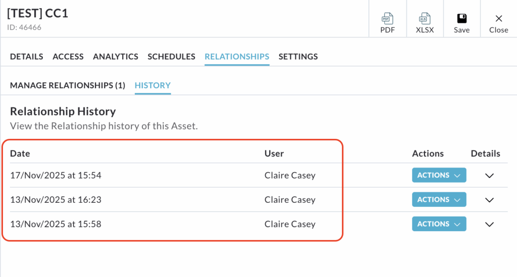The main table displays key information about each recorded change, including the date the change to the asset’s relationship was recorded and the user who made the change.